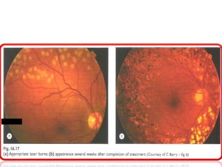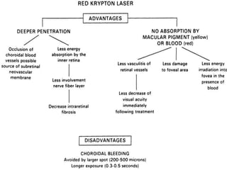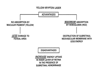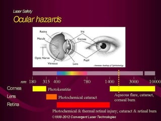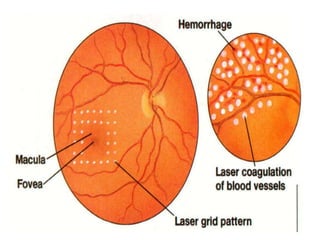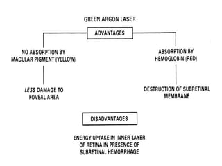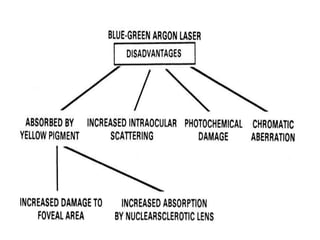 This document provides an overview of lasers and their use in ophthalmology. It begins with definitions of laser and its key properties such as monochromatic, coherent, and collimated light. It then discusses the history and development of lasers from Einstein's work in 1917 to the first laser created by Maiman in 1960. Common laser types and their applications in ophthalmology are covered such as Nd:YAG for retinal photocoagulation and femtosecond lasers for corneal surgery. Safety considerations and potential complications of laser treatment are also summarized.
