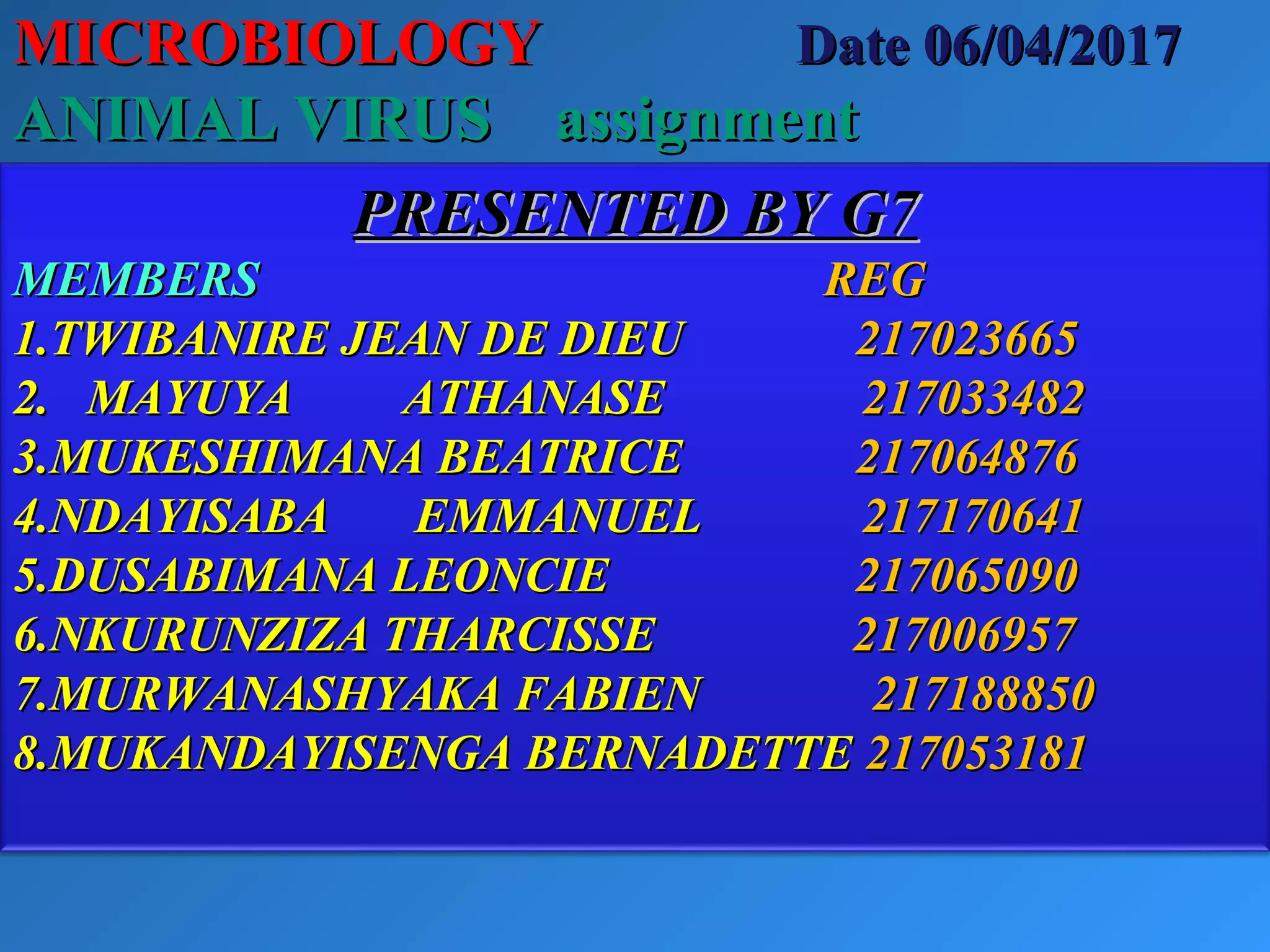This document discusses viruses that affect animals. It begins by defining viruses and describing their structure. It then lists several common viruses that infect cattle and describes the replication cycle of viruses. The document discusses different virus families, modes of transmission, and provides examples of influenza A virus and poliovirus. It concludes by referencing sources for further information.