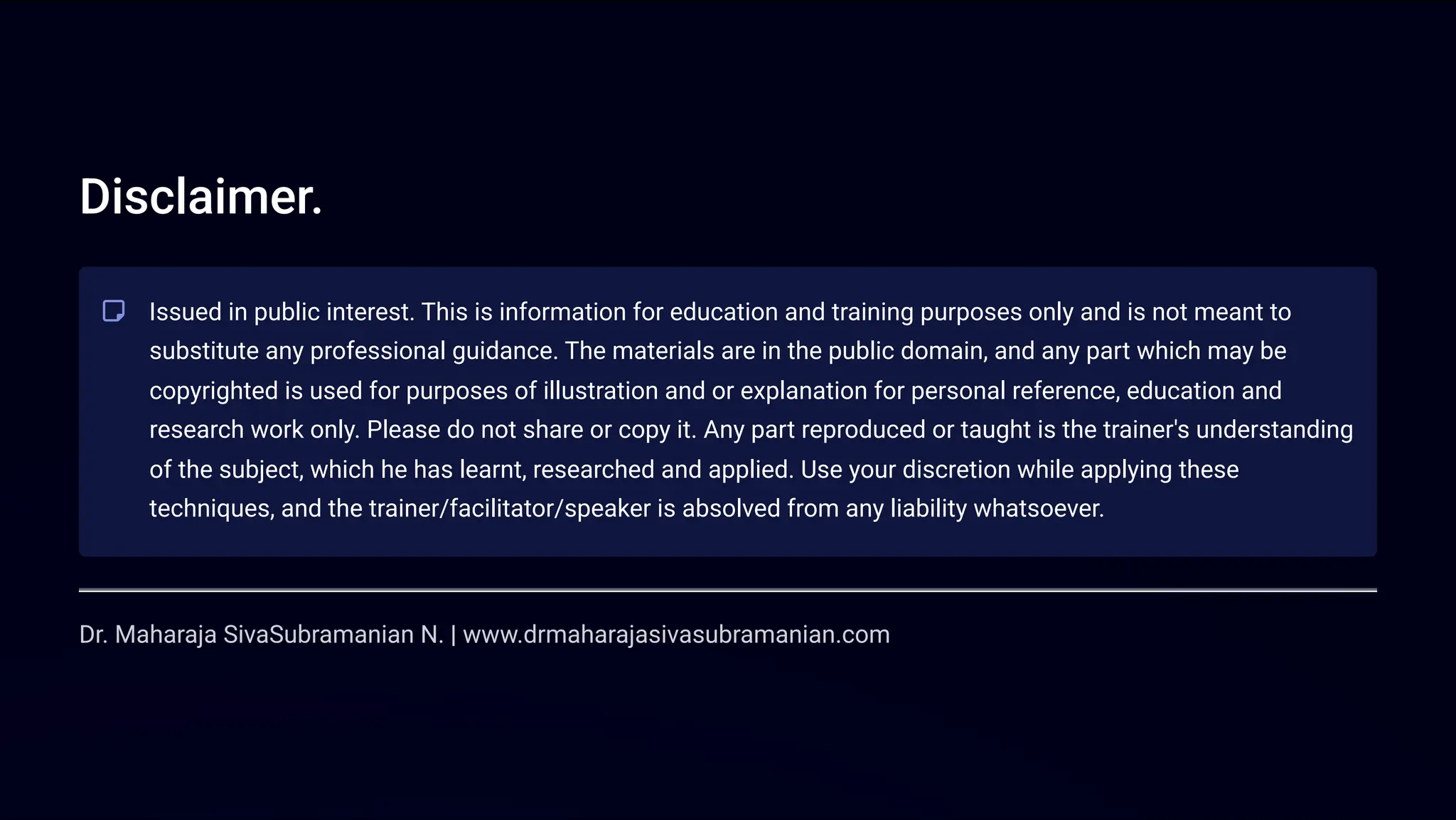 techniques, and the trainer/facilitator/speaker is absolved from any liability whatsoever.