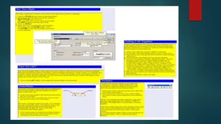 This document provides an overview of AutoCAD, a commercial computer-aided design software. It discusses the history and applications of AutoCAD, including its use in architecture, engineering, graphic design, 3D printing, fashion, and industrial design. The document also outlines some of AutoCAD's key features such as storage and accessibility of files, 3D viewing capabilities, efficient revisions and modifications, speed, and accuracy of dimensions. Autodesk has developed several vertical programs built on the AutoCAD platform for specialized uses.