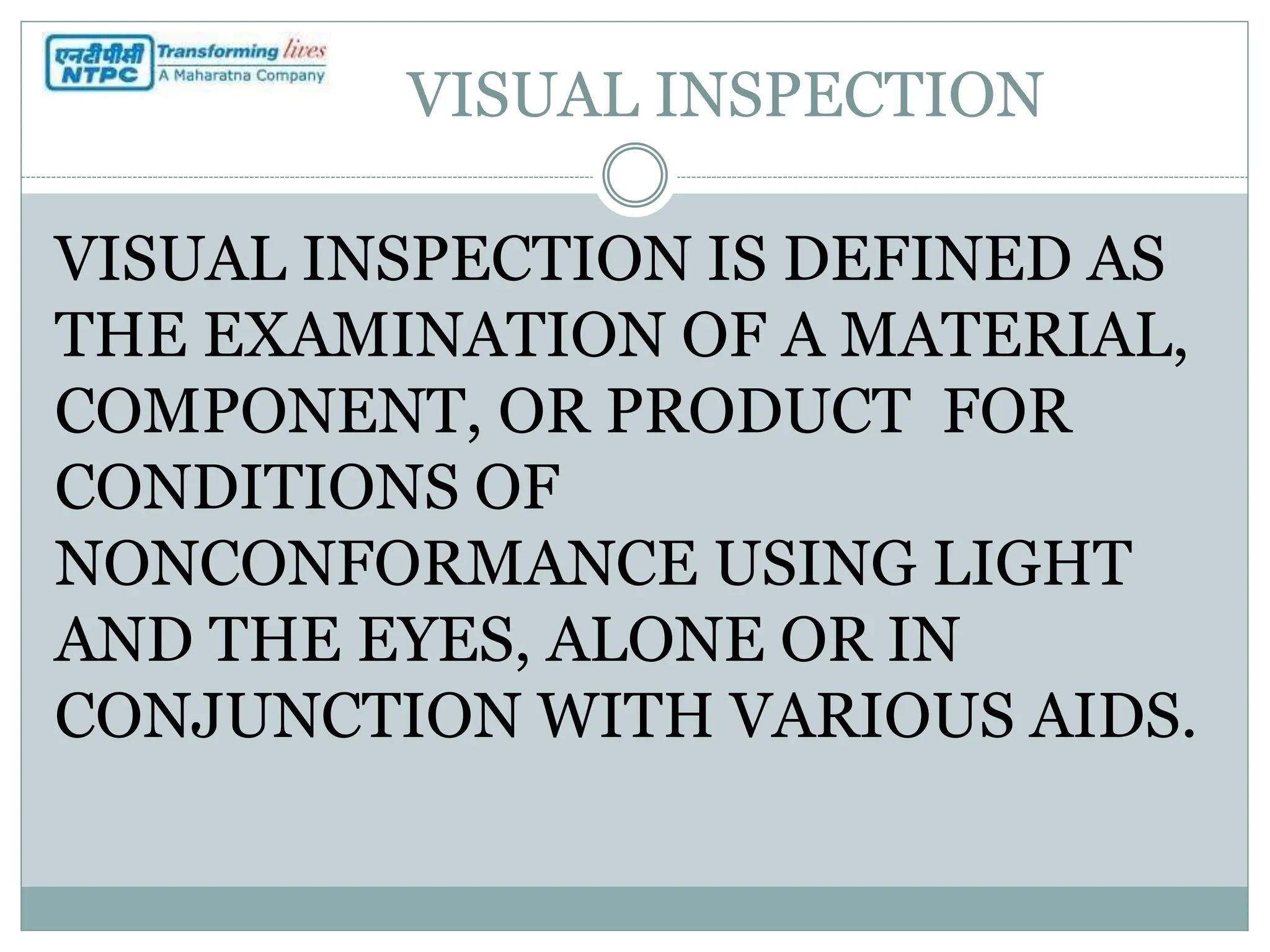 Visual inspection is a fundamental method for examining materials and components for flaws using the naked eye and light, with options for assisted techniques through optical and electronic devices. The effectiveness of visual inspections is influenced by factors such as lighting conditions, the quality of the inspector's detection capabilities, and their training. Machine vision technology has emerged as a valuable tool in automated inspections, particularly in production settings where consistent evaluations are necessary.