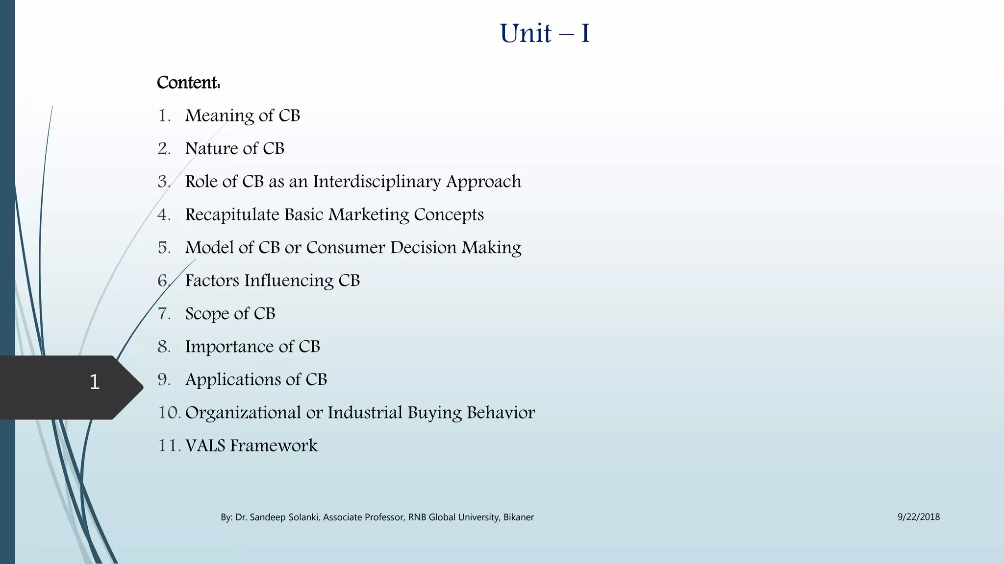 1. The meaning and nature of consumer behavior is defined, focusing on how individuals make decisions to spend resources on consumption items.