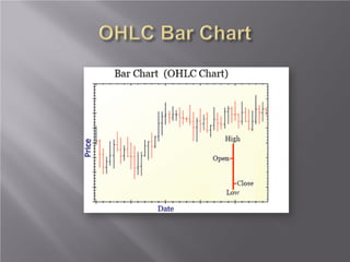 1) Bar charts that show the daily open, high, low, and close prices visually;