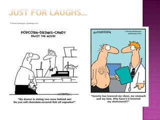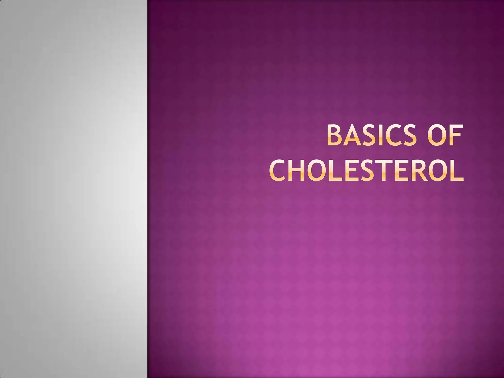 This document discusses ways to prevent high cholesterol through lifestyle changes like maintaining a healthy weight, quitting smoking, eating a healthy diet, and exercising regularly. It identifies risk factors for high cholesterol like smoking, obesity, poor diet, lack of exercise, high blood pressure, diabetes, and family history of heart disease. It also explains how cholesterol levels are calculated and the different types of cholesterol (HDL, LDL, triglycerides), and recommends treatment options like dietary changes or medication.