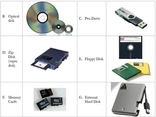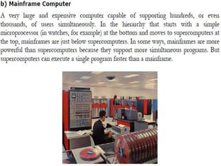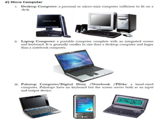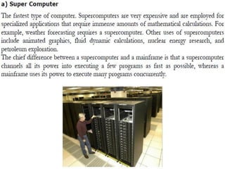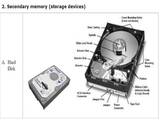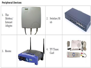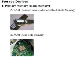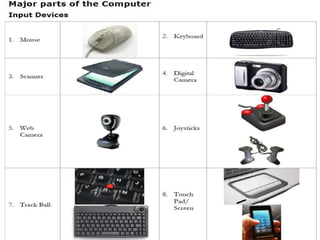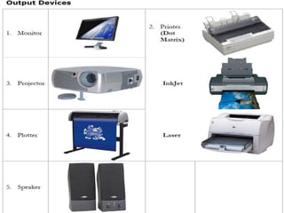 - Explanations of different types of input devices like keyboards and mice, output devices like monitors and printers, and storage devices like hard drives and optical drives.