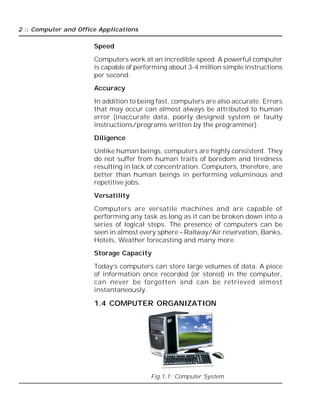 The document explains fundamental concepts of computers, highlighting their components, including hardware and software. It details the characteristics, organization, and functions of computer systems, as well as types of memory, input/output devices, and software classifications. Additionally, it covers programming languages, including machine, assembly, and high-level languages, and introduces the concept of open-source software.