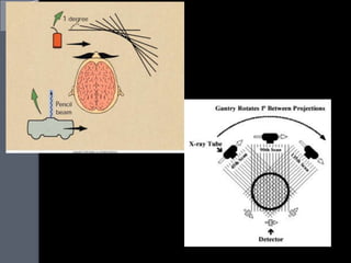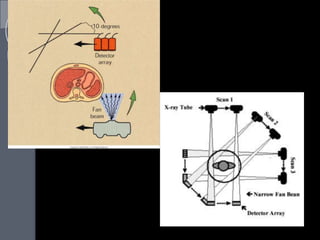 This document provides an overview of computed tomography (CT) and magnetic resonance imaging (MRI). It discusses the history and development of CT from the early 1970s to present day, including the evolution from first to fifth generation CT scanners. Key aspects of CT technology covered include the basic principles, components like the x-ray tube and detectors, and types of scans like conventional tomography and cone beam CT. The document also briefly introduces magnetic resonance imaging.