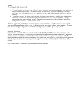 This document outlines a three-step strategy to help reduce debt. Step 1 is to track spending for three months to understand where money is going and compare expenses to income. Step 2 is to stop using credit cards and pay off the highest interest debt first while consolidating other debts. Step 3 is to build savings by setting up separate savings accounts for emergencies, family expenses, and long-term goals and redirecting debt payments towards growing savings instead of going back into debt. Following this plan can help control cash flow, pay off debt over time, and encourage saving to better handle future expenses.