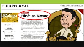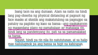 The document discusses editorial writing, explaining that it reflects the newspaper's opinion, aims to influence public opinion, and should promote critical thinking while maintaining clarity and moral purpose. It outlines the structure of a good editorial, including components like the title, lead, body, and conclusion, and also distinguishes it from column writing, which reflects individual opinions. Furthermore, it emphasizes the importance of supporting arguments with evidence and maintaining objectivity by addressing opposing viewpoints.