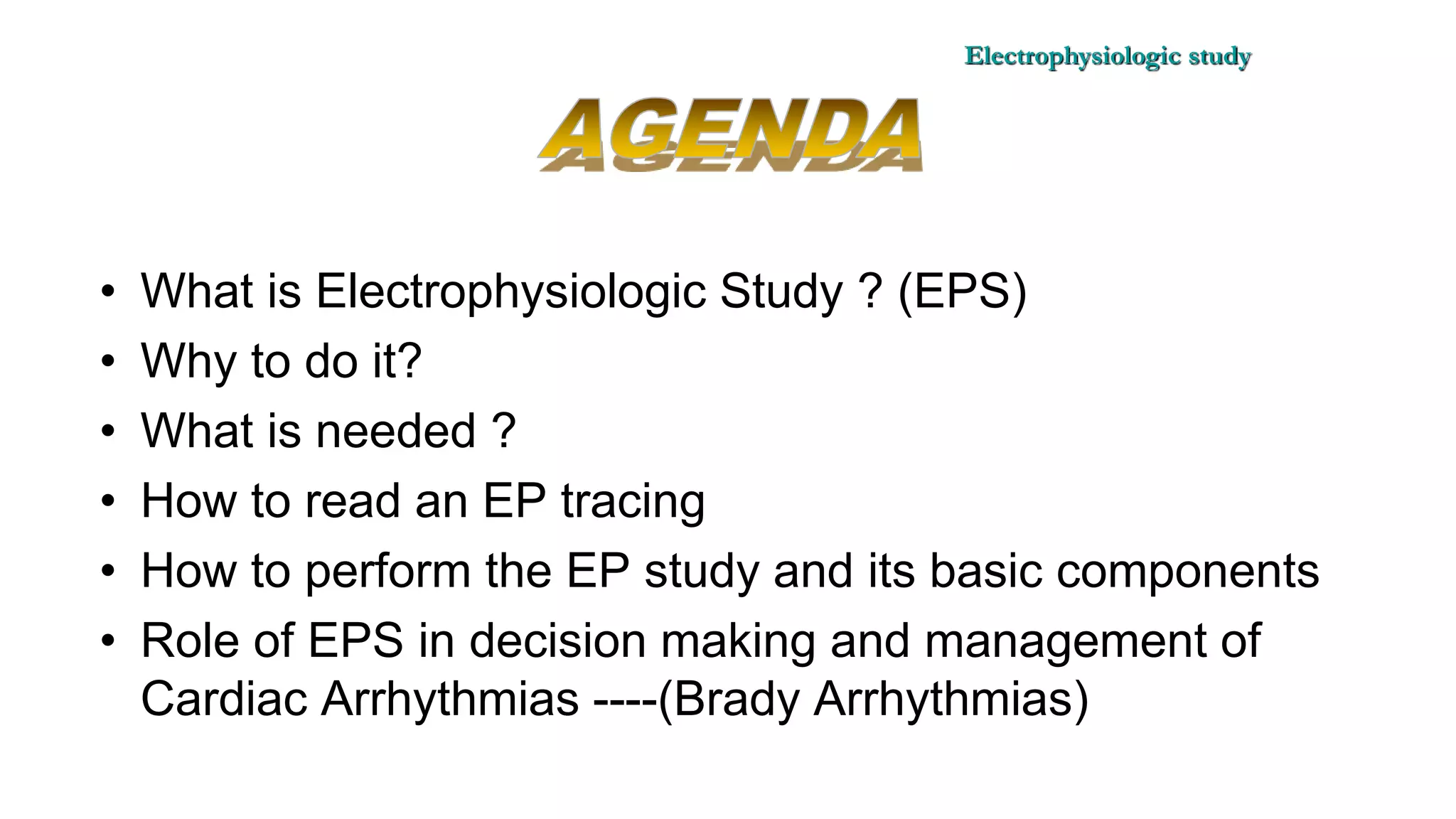 An electrophysiologic study involves inserting electrode catheters into the heart to record electrical activity and induce arrhythmias. The document discusses: 1. The procedure involves placing catheters in the heart to record electrograms from the atria, His bundle, ventricles and coronary sinus. 2. The aims are diagnostic to evaluate arrhythmias and bradycardias, and therapeutic for ablation of arrhythmias. 3. Key measurements taken include intervals between P waves, His bundle activation and QRS complex to identify conduction abnormalities. 4. Tracings are analyzed to determine the rhythm, sequence of activation, effects of pacing, and identify arrhythmia mechanisms like accessory pathways