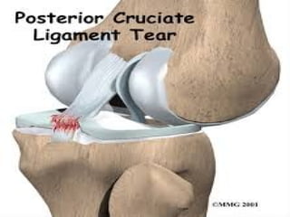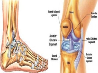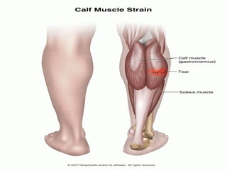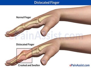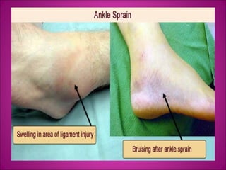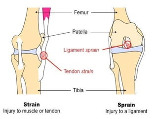This document provides information on basic first aid, common injuries like sprains, strains, fractures and dislocations. It describes the differences between sprains and strains, signs and symptoms. Treatment recommendations include RICE (Rest, Ice, Compression, Elevation) for sprains, strains and fractures. Home treatments and when to see a doctor are outlined. Prevention tips like proper warm up/cool down and using correct form are also mentioned.