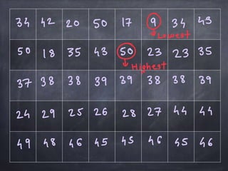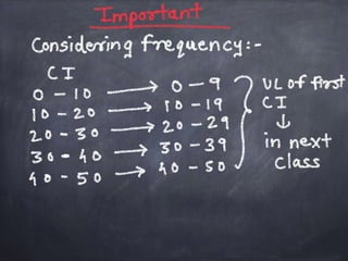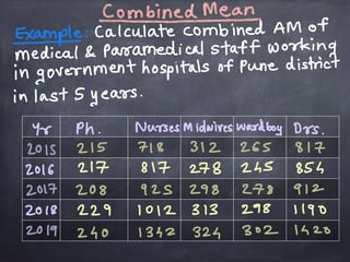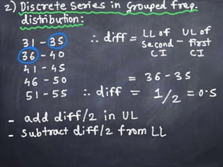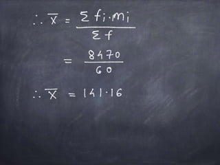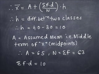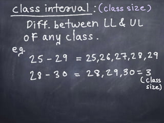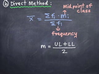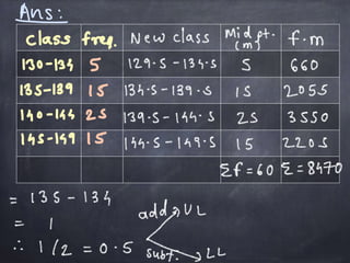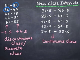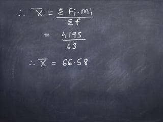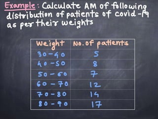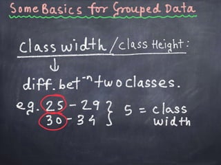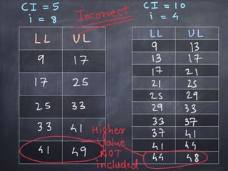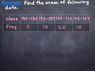 This document discusses grouped data, means, and confidence intervals. It contains two tables showing the weight and number of patients in different ranges, such as 30-40, 40-50, etc. It also mentions tally marks, frequency, new class intervals, and mid points that are used to analyze grouped data and calculate the mean. The document concludes with a quote by Mark Twain about the pliability of statistics compared to stubborn facts.