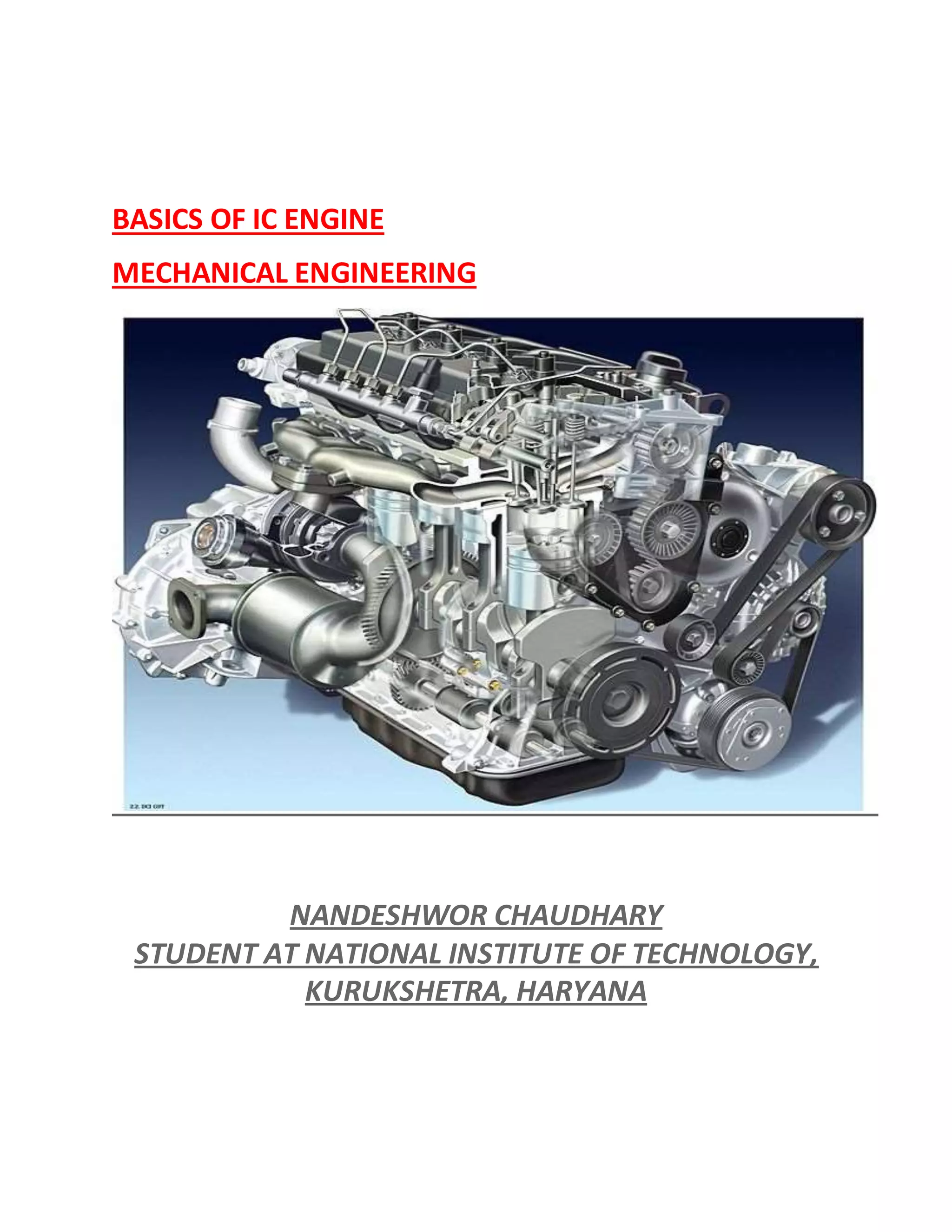 The document provides information on the basics of internal combustion (IC) engines. It discusses the differences between two-stroke and four-stroke engines, the sequence of operations in an IC engine cycle, valve timing diagrams for petrol and diesel engines, and comparisons of petrol and diesel engines. It also covers topics like scavenging, ignition systems, supercharging, lubrication, governing, carburetors, spark plugs, detonation, and octane ratings of fuels for spark ignition engines.