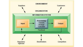 The document provides an overview of Management Information Systems (MIS), detailing its components, functions, characteristics, advantages, and disadvantages. MIS aids in decision-making, improves efficiency, and requires integrated processes with a focus on management needs. However, it can be costly to implement and relies heavily on technology.