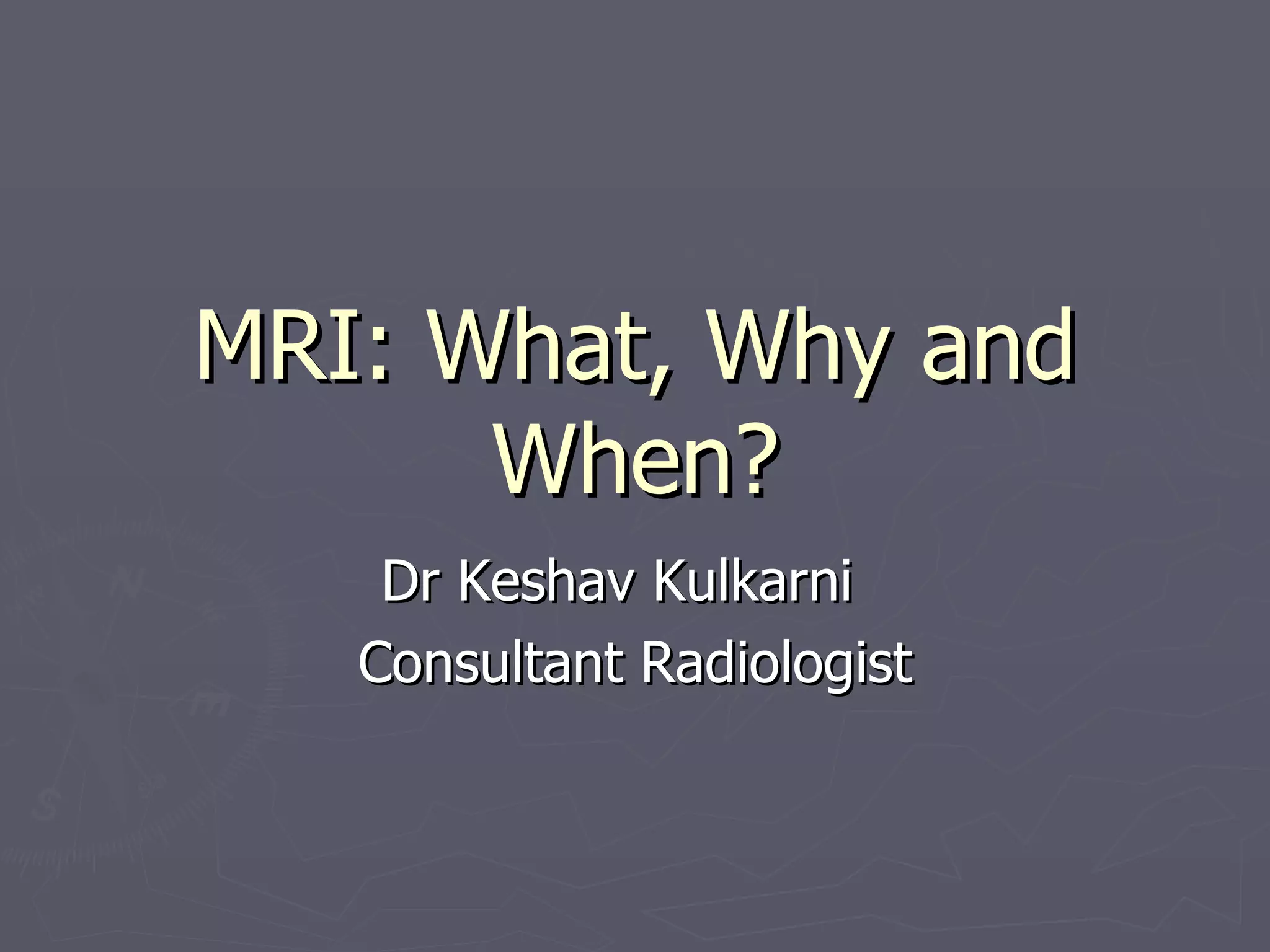 The document provides an overview of magnetic resonance imaging (MRI), including how it works, the types of images it can produce, and its applications in various parts of the body. It explains that MRI uses strong magnetic fields and radio waves to align hydrogen protons in the body and produce signals used to form images. Key applications mentioned include neuroimaging, musculoskeletal imaging, and evaluating diseases of the abdomen, blood vessels, heart, breast and fetus.