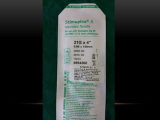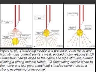 1. Electrical nerve stimulation uses controlled electrical currents to locate nerves through eliciting motor responses or paraesthesia.