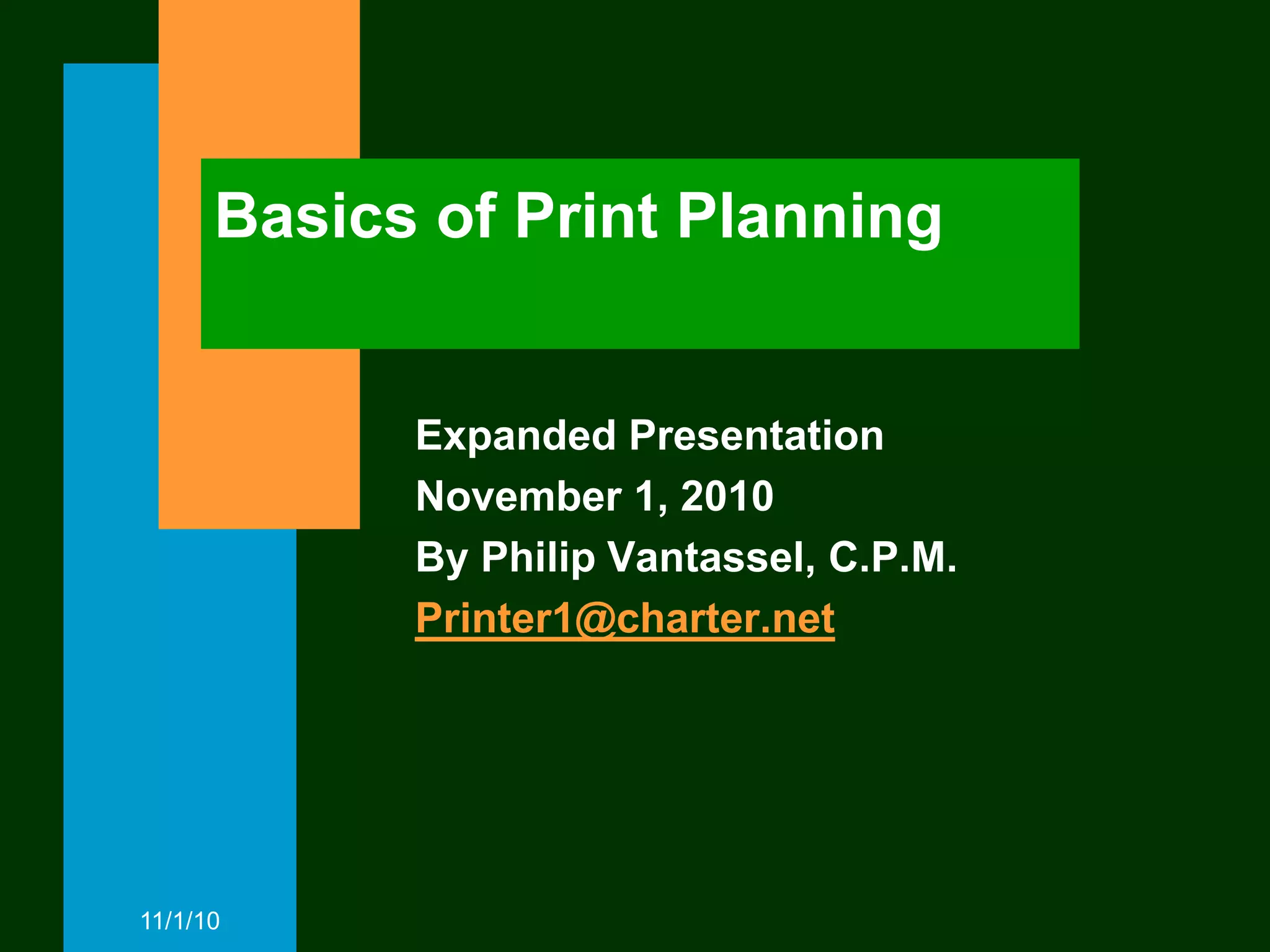 The document discusses the basics of print planning using the START acronym: S (substrate), T (type of work), A (arrangement), R (resources), and T (total). It explains that the substrate could be paper, plastic, foil, or other materials. The type of work determines what equipment and finishing processes are needed, such as cutting, folding, binding. The arrangement considers how items are laid out and finishing. Resources include materials, inks, and outside services. The total quantity affects how the job is printed.