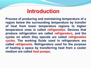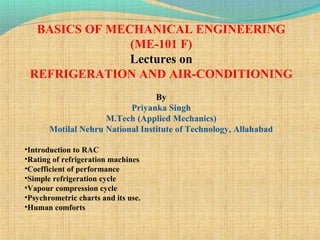 The document covers the fundamentals of refrigeration and air-conditioning, including the refrigeration cycle, types of refrigeration machines, and the performance metrics such as the coefficient of performance (COP). It details the vapor-compression refrigeration cycle, absorption refrigeration systems, and the psychrometric properties essential for air-conditioning. The importance of human comfort in relation to air quality parameters is also discussed, highlighting factors that influence comfort levels.