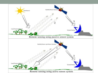 Remote sensing involves obtaining information about objects without physical contact. It works by sensing and recording electromagnetic radiation reflected or emitted from targets. The key components are an energy source, sensor, platforms, and data analysis to extract information. Sensors can be optical, thermal, or microwave. Platforms include satellites, aircraft, and ground bases. Applications of remote sensing include agriculture, forestry, geology, hydrology, urban planning, and national security.