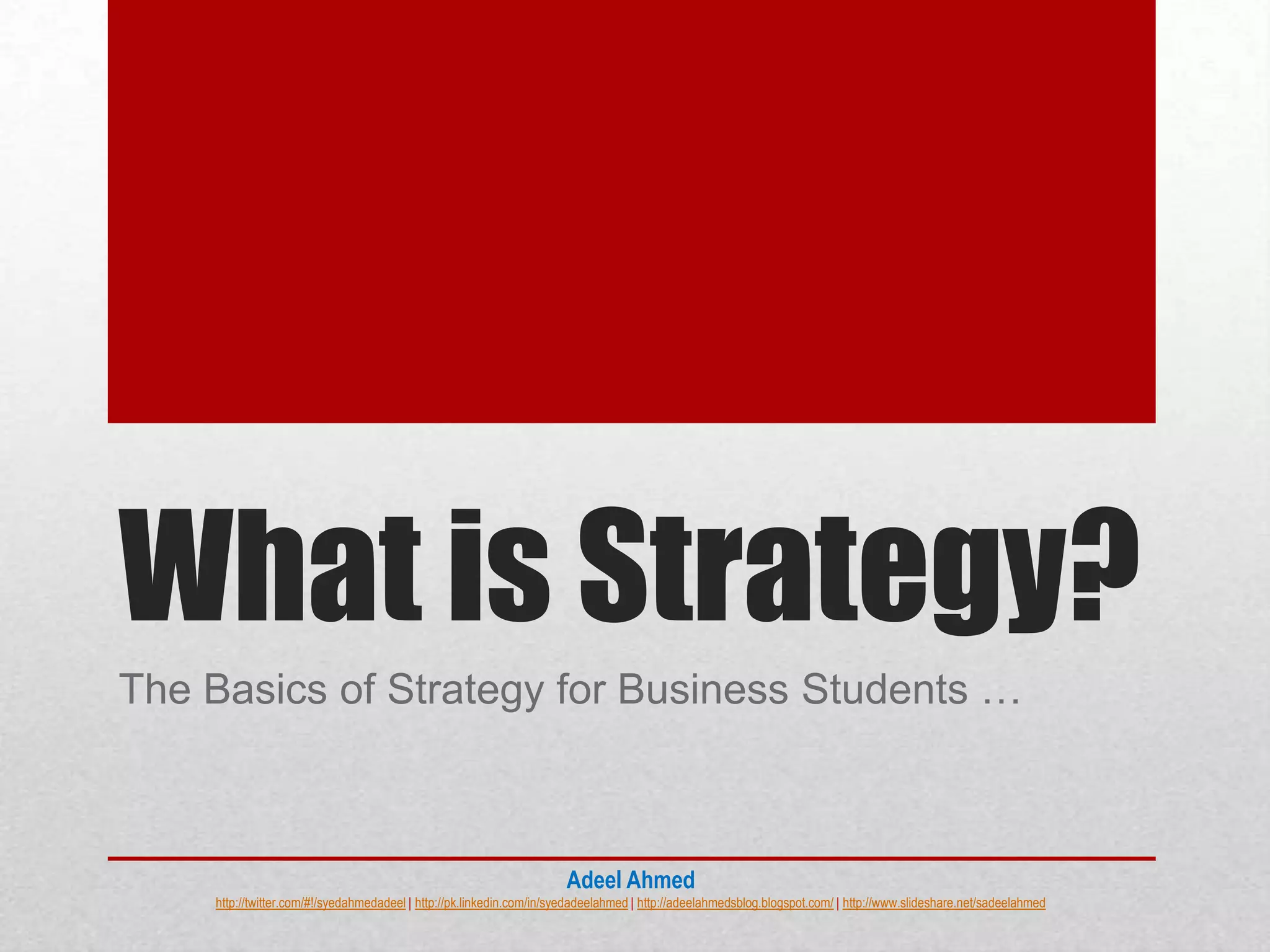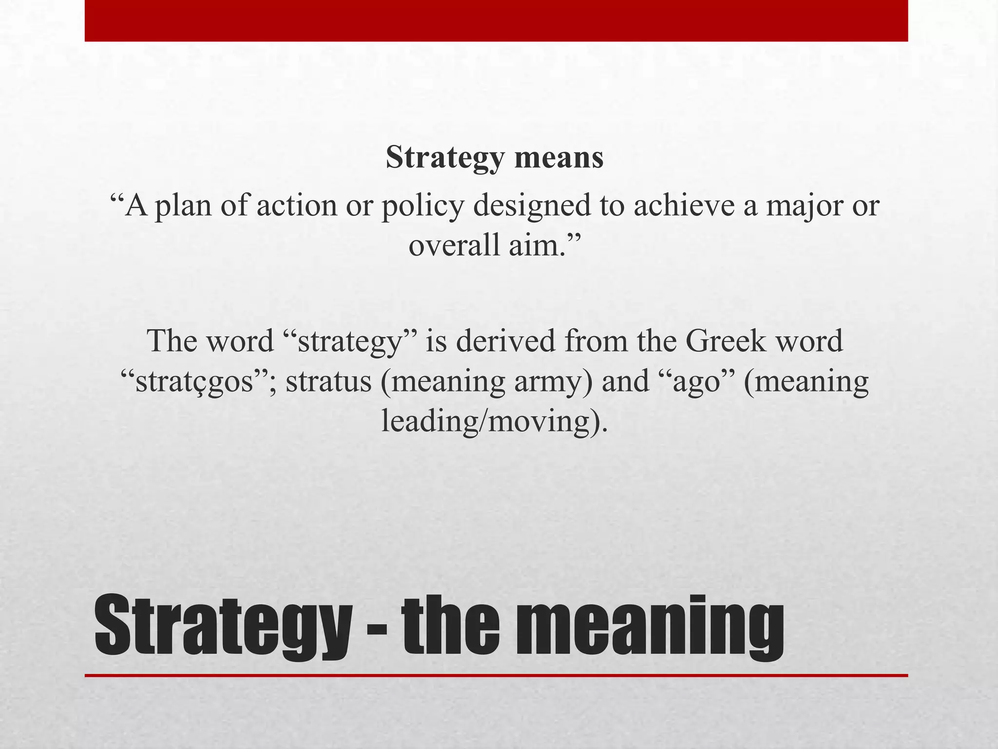 Strategy refers to a plan of action designed to achieve long-term aims and goals. It involves making decisions that account for uncertainty and the probable behaviors of competitors, customers, and employees. An effective strategy bridges the gap between an organization's current situation and its desired future state. It defines the overall mission, vision, and direction of an organization to maximize its strengths and minimize competitors' strengths.