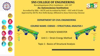This document provides an overview of structural analysis for a course on the topic at SNS College of Engineering. It defines key terms like bending moment, shearing force, and equilibrium. It explains the objectives of studying structural analysis, including introducing classical analysis methods. It outlines the outcomes students will achieve in learning to analyze different structural elements like continuous beams and rigid frames using various techniques. The first unit focuses on the strain energy method and how to apply it to continuous beams, frames, and trusses with up to two degrees of redundancy.