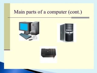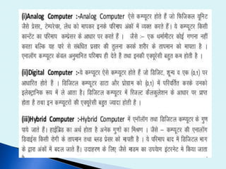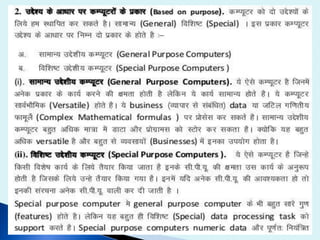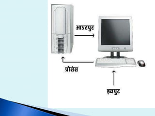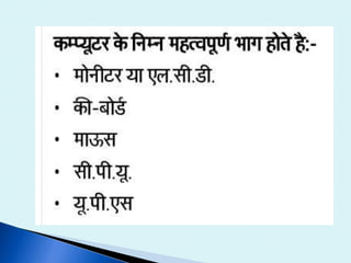 The document discusses the various input and output devices that comprise a computer system. It lists common input devices like the keyboard, mouse, joystick, light pen, trackball, graphic tablet, microphone, and magnetic ink card reader. Output devices mentioned include monitors in various technologies like LED and LCD, printers of all types, plotters, projectors, LCD projection panels, speakers, headphones, and visual display units. The presentation was given by Mr. Sanjay Shinde and students from the 5th semester of B.Sc to discuss the components of a computer.