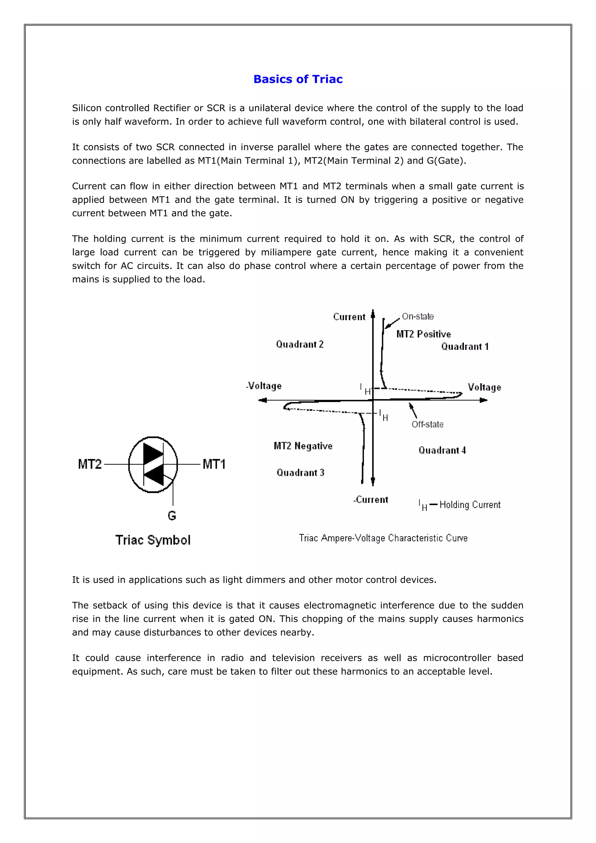 3) Triacs find applications in light dimmers and motor speed controls. However, they can cause electromagnetic interference due to sudden current changes, producing harmonics that may interfere with other electronic devices. Filtering is required to reduce harmonics to acceptable levels.
