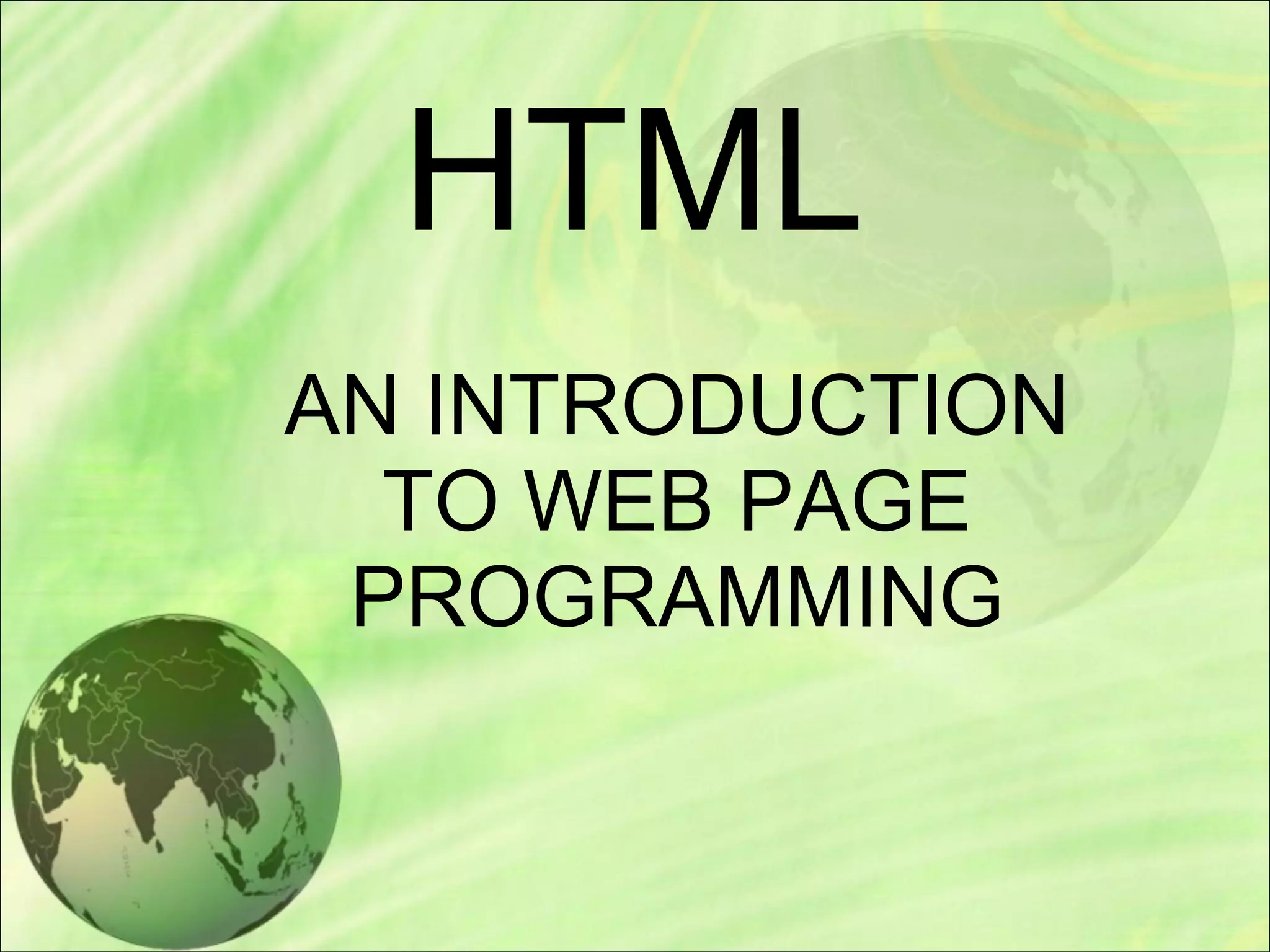 This document serves as an introduction to HTML, explaining its purpose as a markup language used for creating web pages. It covers basic HTML elements, syntax, and tags, and provides examples for text formatting, lists, images, tables, and hyperlinks. The document is aimed at guiding beginners in writing HTML code and understanding how web browsers interpret it.