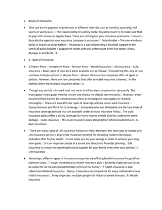 One can pay insurance premiums monthly, quarterly, semi-annually, or annually. The policy holder is responsible for paying premiums regularly to the insurer, either an agent or insurance company. Insurance provides financial support to the policy holder's family in the event of death, illness, damage, or accidents. There are many types of insurance plans available, including children's plans, investment plans, pension plans, health insurance, life insurance, auto insurance, and more. Insurance companies offer various options for policyholders to choose from.