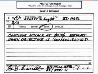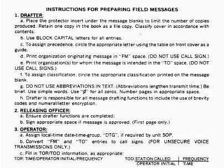 The document provides information about signal communications equipment and procedures used by the military. It discusses various radio sets like the AN/PRC-77 and AN/GRC-160 that are used for voice communication. It also covers telephone equipment and procedures for operating the different radios. The document aims to familiarize readers with the communications systems and how to use them properly.