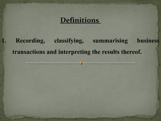 This document provides an introduction to key accounting concepts and terms. It defines accounting as the process of identifying, recording, classifying, summarizing, and communicating financial information. The key concepts covered include the accounting equation, double-entry bookkeeping system, accounting cycle, journals, ledgers, debits and credits, and types of accounts. Examples are provided to illustrate basic accounting transactions and how they are recorded using debits and credits according to the rules of double-entry bookkeeping.