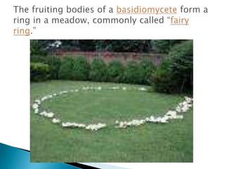 The document discusses the club fungi (Basidiomycota), a taxonomic division of fungi that reproduce sexually through specialized club-shaped cells called basidia. Basidia normally bear four external meiospores and are found on the gills under the cap of mushrooms. One example is the fairy ring fungus, whose underground mycelium depletes soil nitrogen as it grows outward in a circle, forming a fairy ring where fruiting bodies appear. Basidiomycota are important as they include edible mushrooms and produce spores via basidia after the fusion and meiosis of genetic material from two mating strains.