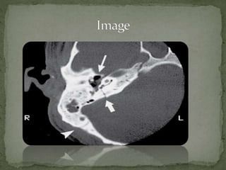 A 33-year-old woman presented to the emergency department after being struck behind the right ear by a flying baseball bat at a baseball game. She reported pain, tinnitus, dizziness, and slurred speech but denied loss of consciousness or nausea. Examination revealed right facial motor weakness, tenderness over the right mastoid bone, and right hemotympanum. CT scan showed a transverse temporal bone fracture and air in the internal auditory canal, consistent with a basilar skull fracture.