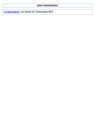 Il documento descrive la preparazione dei lampascioni in agrodolce, un piatto della cucina della Basilicata, evidenziando anche la tradizione dei timbri per il pane. Viene approfondita l'enogastronomia lucana, con particolare attenzione ai vini, salsicce e formaggi tipici della regione, come l'Aglianico del Vulture e il Canestrato di Moliterno. Infine, il testo menziona Maratea come meta turistica da visitare, con eventi enogastronomici e un panorama costiero affascinante.
