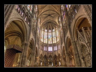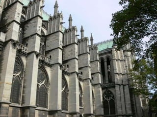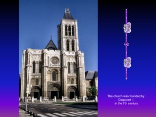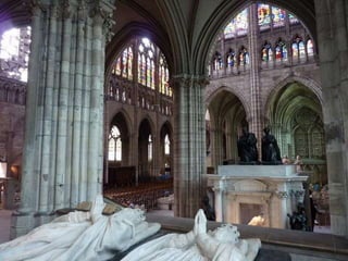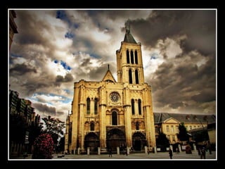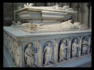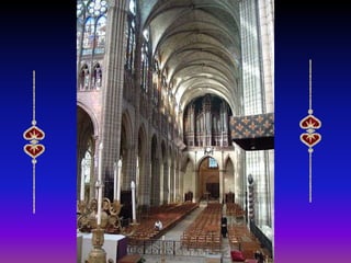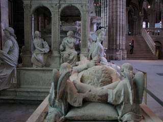 The Basilica of Saint Denis is located in a northern suburb of Paris and is the burial site of most French monarchs dating back to the 7th century. It was founded as the abbey church of the Benedictine Monastery of Saint Denis by Dagobert I. Unlike Westminster Abbey, Saint Denis was not used for coronations but rather served as a royal necropolis. The basilica contains many ornate tombs of French royalty including Louis XII and Anne of Brittany as well as Henry II and Catherine de Medici.