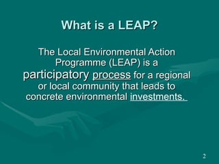 The document provides an overview of the Local Environmental Action Programme (LEAP) process. LEAP is a participatory process that leads to concrete environmental investments within a local community. It focuses on short-term priorities and action plans that can be implemented with available local or national resources. Key steps in the LEAP process include identifying environmental problems, setting priorities, developing actions, and involvement of various stakeholders from the community, local authorities, industries and NGOs. The document outlines the roles and resources provided by the LEAP facilitators, project support, and local municipalities to guide the LEAP planning and implementation process.