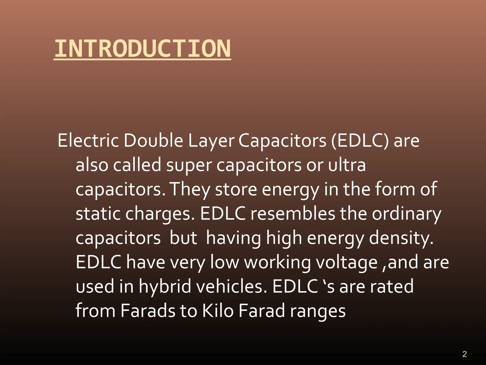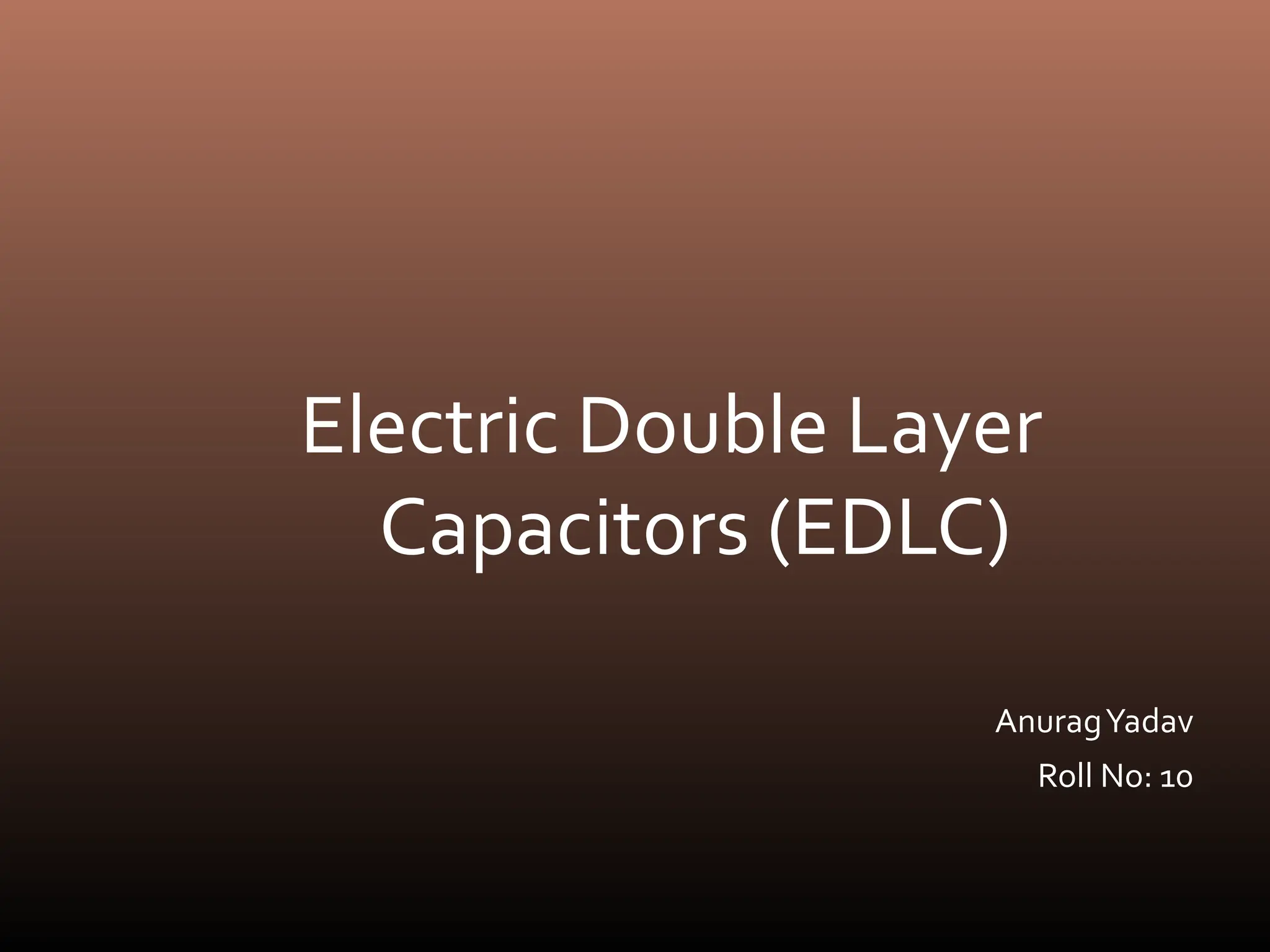 Electric double layer capacitors (EDLCs), also known as supercapacitors or ultracapacitors, store energy through static charges in an electric double layer at the interface between electrode and electrolyte surfaces. They resemble conventional capacitors but have much higher energy density. EDLCs use activated charcoal or carbon nanotubes as electrodes to provide a large surface area for charge storage, and ions in the electrolyte form separated layers of charge on either side of the electrode surfaces when a voltage is applied. While having advantages like rapid charging/discharging and long lifecycles, EDLCs also have lower energy density than batteries. They find applications requiring high power delivery like hybrid vehicles and consumer electronics.
