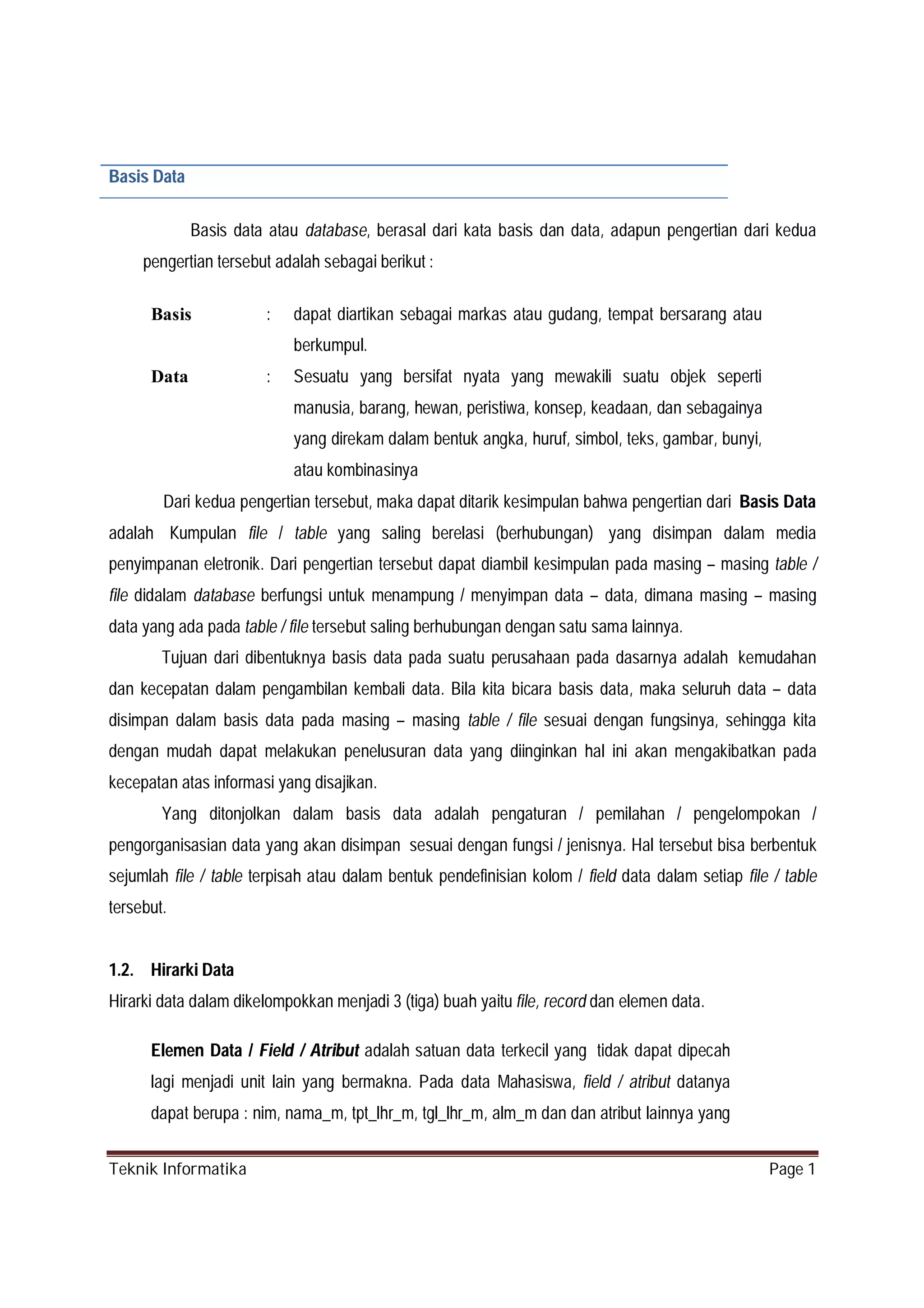 Basis data merupakan kumpulan file atau tabel yang saling berhubungan dan disimpan dalam media penyimpanan elektronik. Basis data dikelola oleh sistem manajemen basis data (DBMS) dan dimanfaatkan oleh beberapa pengguna untuk mengakses dan memanipulasi file atau tabel tersebut. Komponen utama sistem basis data terdiri atas perangkat keras, sistem operasi, basis data, DBMS, dan pengguna.