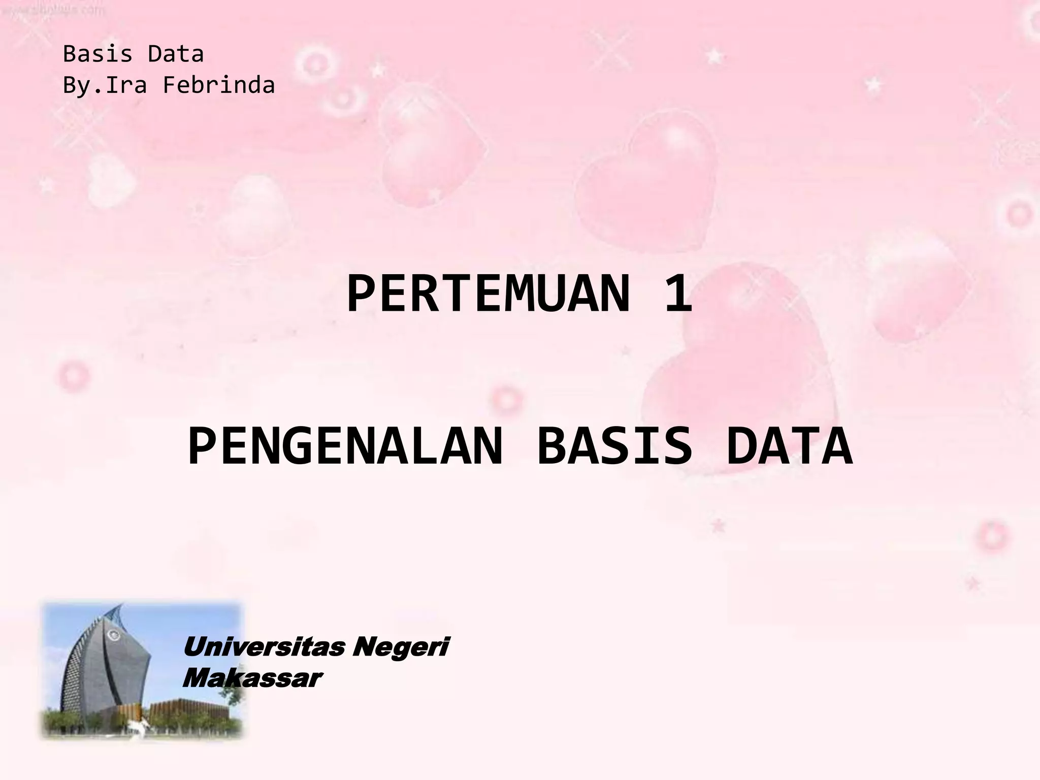Dokumen ini mengenalkan konsep basis data, menjelaskan definisi, tujuan, operasi dasar, dan pemanfaatan dalam berbagai bidang seperti pendidikan, perbankan, dan kesehatan. Basis data bertujuan untuk meningkatkan kecepatan, akurasi, dan efisiensi dalam pengelolaan data. Selain itu, dokumen juga menguraikan struktur sistem basis data dan bahasa yang digunakan untuk berinteraksi dengan basis data.