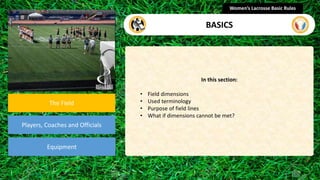 This document discusses the dimensions and markings of a women's lacrosse field based on official rules. It details the length and width of the field, placement and sizes of lines, circles, and other markings like the goal, crease, and restraining lines. Alternative field configurations are suggested if official dimensions cannot be met due to space constraints.