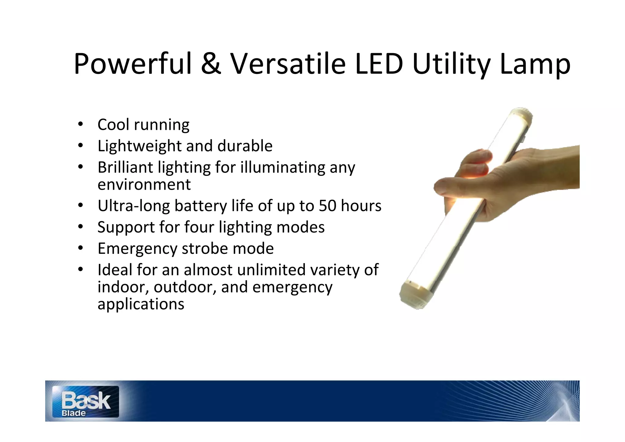 This document provides specifications for a portable LED light. It is 300mm long, powered by a 5W internal battery that can be charged via USB. It has an on/off button, charge indicator, and reset button. It is water resistant and comes with a wrist lanyard. Accessories include standard and large lamp stands, mini tripods, and magnetic claw grips. It is designed for uses like camping, cycling, hiking, outdoor parties, reading, projects, and emergencies.