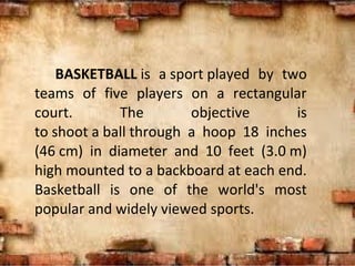 Basketball is a team sport played on a rectangular court with the aim of scoring points by shooting a ball through a hoop. Originating in December 1891 by Dr. James Naismith, the game has evolved to become one of the most popular sports worldwide, featuring various scoring methods including two-point and three-point shots. The sport also inspired fantasy basketball, which gained popularity in the 1990s with the rise of the internet.