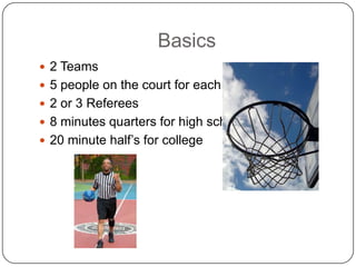 Basketball is played between two teams of 5 players each on a court overseen by 2-3 referees. Games consist of 8 minute quarters for high school and 20 minute halves for college, with rules prohibiting walking with the ball, double dribbling, pushing/shoving, and requiring dribbling, shooting, or passing. The document provides instruction on proper shooting form by placing the ball in the palm and flicking the wrist, as well as dribbling tips like using the dominant hand and fingertips while keeping the ball below the waist and looking up.