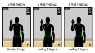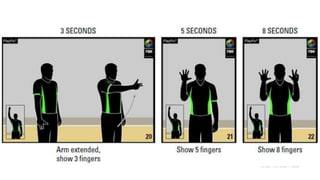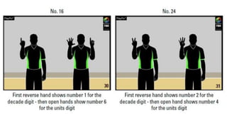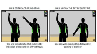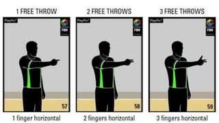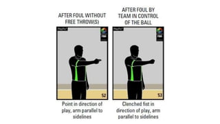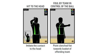 This document outlines various hand signals used by officials in basketball games to communicate scoring, timeouts, substitutions, violations, fouls, number of players, and other key information during gameplay. The signals provide a visual method for referees to notify coaches, players, and spectators about events, penalties, and the status of the game clock without interrupting play with verbal announcements.
