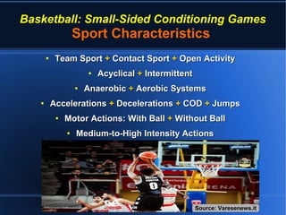 The document discusses small-sided conditioning games (SSCG) in basketball, outlining their role in enhancing endurance, technical-tactical actions, and overall physical conditioning for players. It emphasizes the importance of specific training methodologies that simulate game scenarios to develop various athletic qualities, including speed and agility. Additionally, it provides insights into performance metrics such as heart rate and distance covered during matches, highlighting differences among elite, sub-elite, and youth players.
