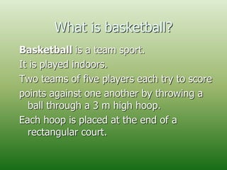 Basketball is a team sport played indoors where two teams of five players each try to score points by throwing a ball through a hoop. James Naismith invented basketball in 1891 with two teams of nine players using peach baskets and an ordinary soccer ball. The game has since evolved with professional leagues forming, set rules on movement and scoring, and international competitions. Basketball is now one of the most popular sports worldwide played on a rectangular court with goals at each end.