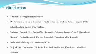 1. The document discusses exporting Basmati rice from India to Dubai. It outlines the group members, varieties of Basmati rice grown in India, and reasons for selecting rice and Dubai as the export destination.