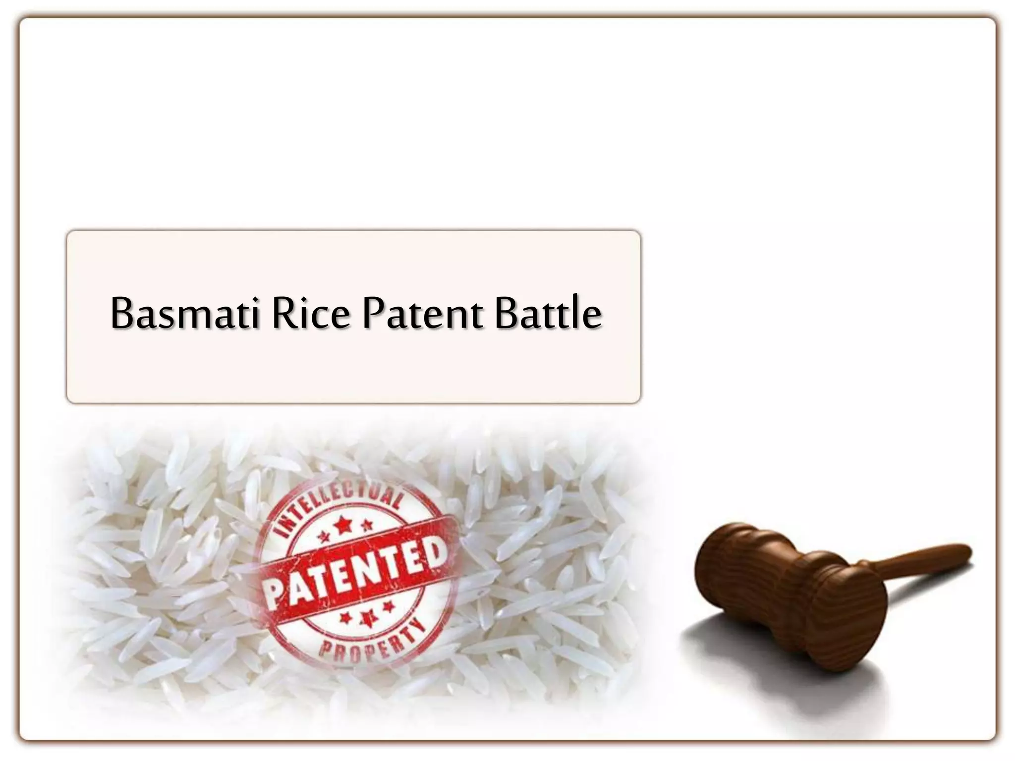 This document discusses the Basmati rice patent battle between RiceTec Inc., an American company, and India. RiceTec was granted a patent by the US Patent Office in 1997 to call aromatic rice grown outside of India "Basmati". India objected because Basmati rice is traditionally grown in India and Pakistan. While RiceTec claimed its rice was novel, India argued the patent violated geographical indication laws and would negatively impact Indian Basmati rice exports. Ultimately, RiceTec withdrew 15 of its 20 patent claims and removed the term "Basmati" in response to protests from India.