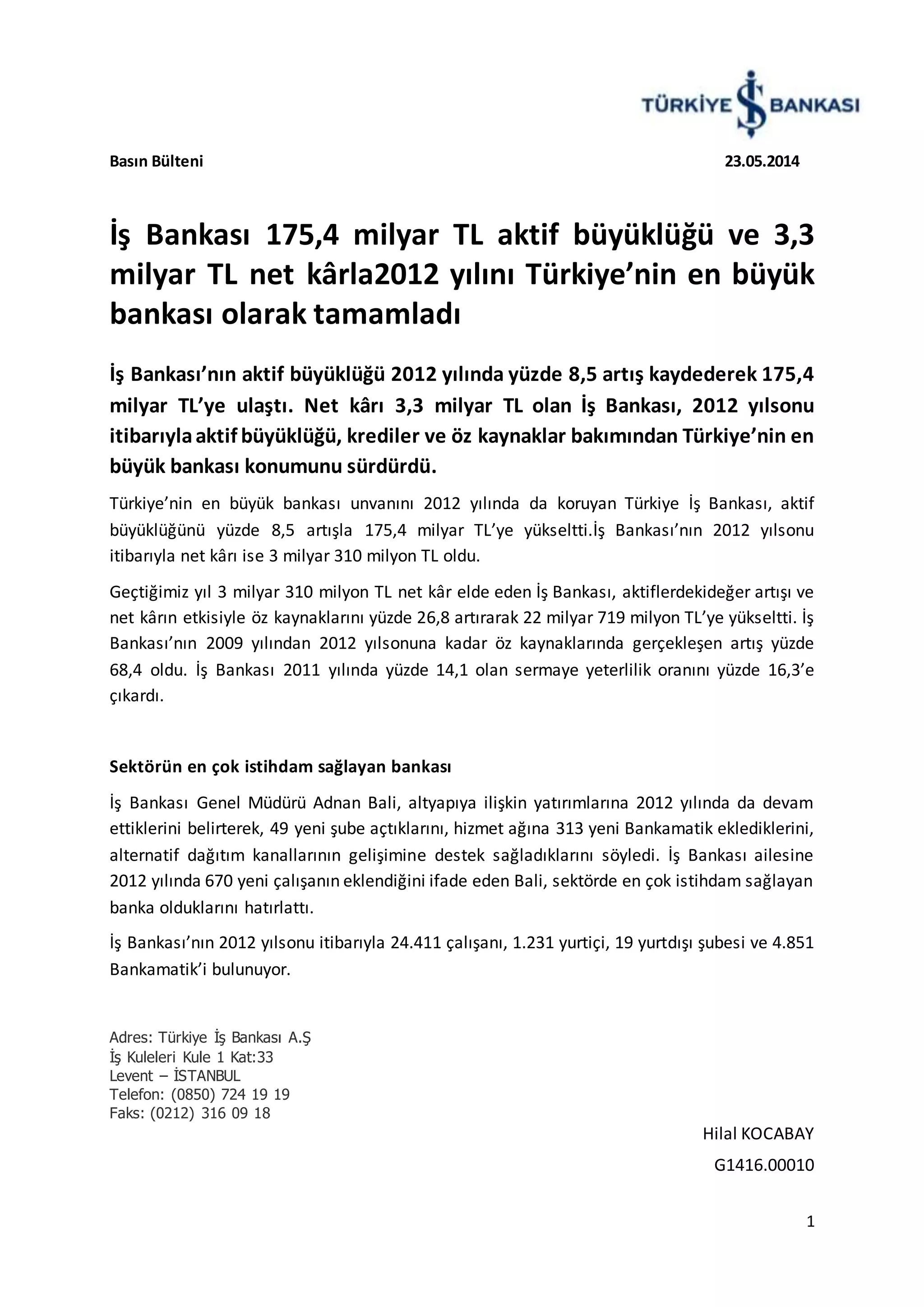 büyüklüğünü yüzde 8,5 artışla 175,4 milyar TL’ye yükseltti.İş Bankası’nın 2012 yılsonu