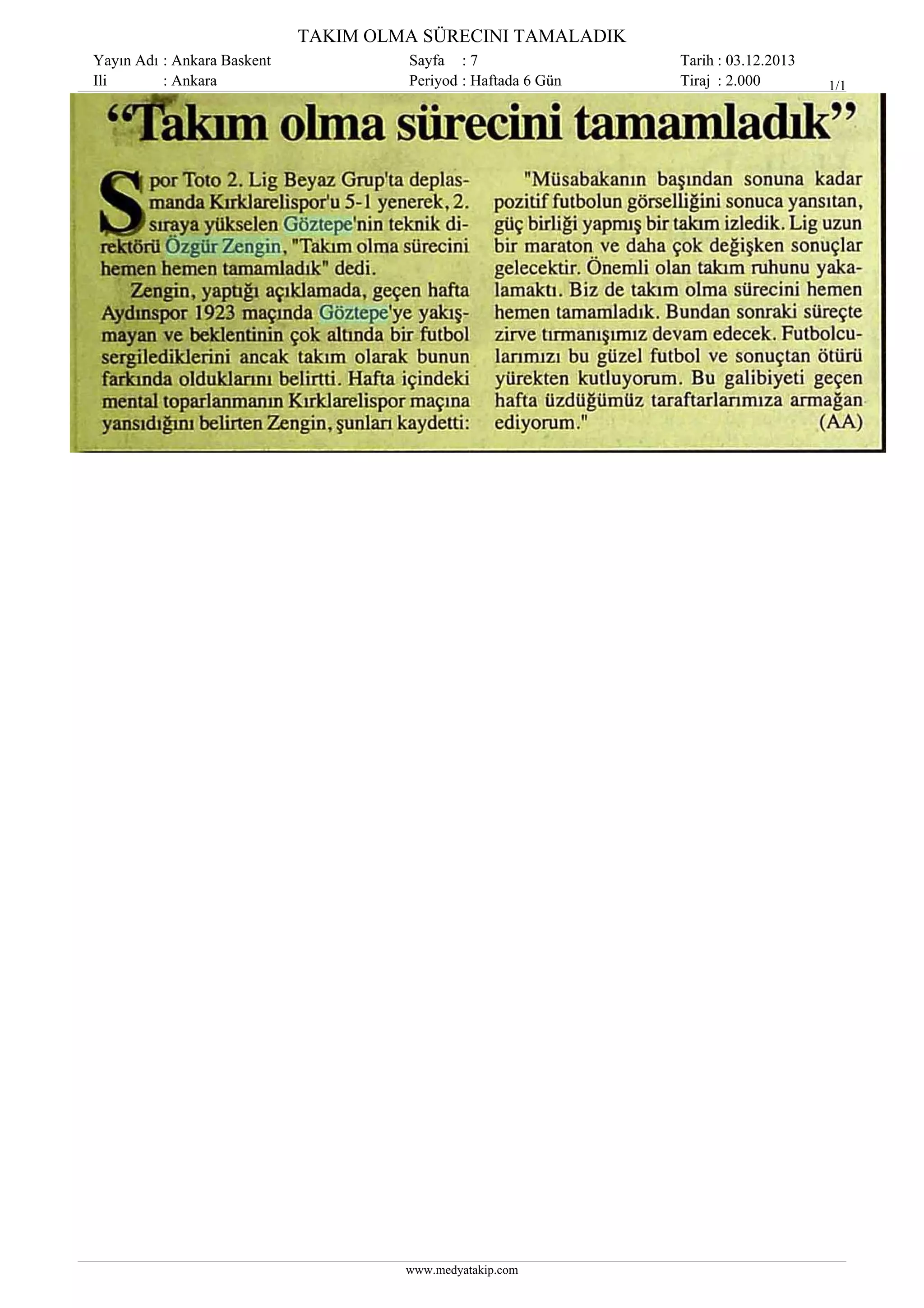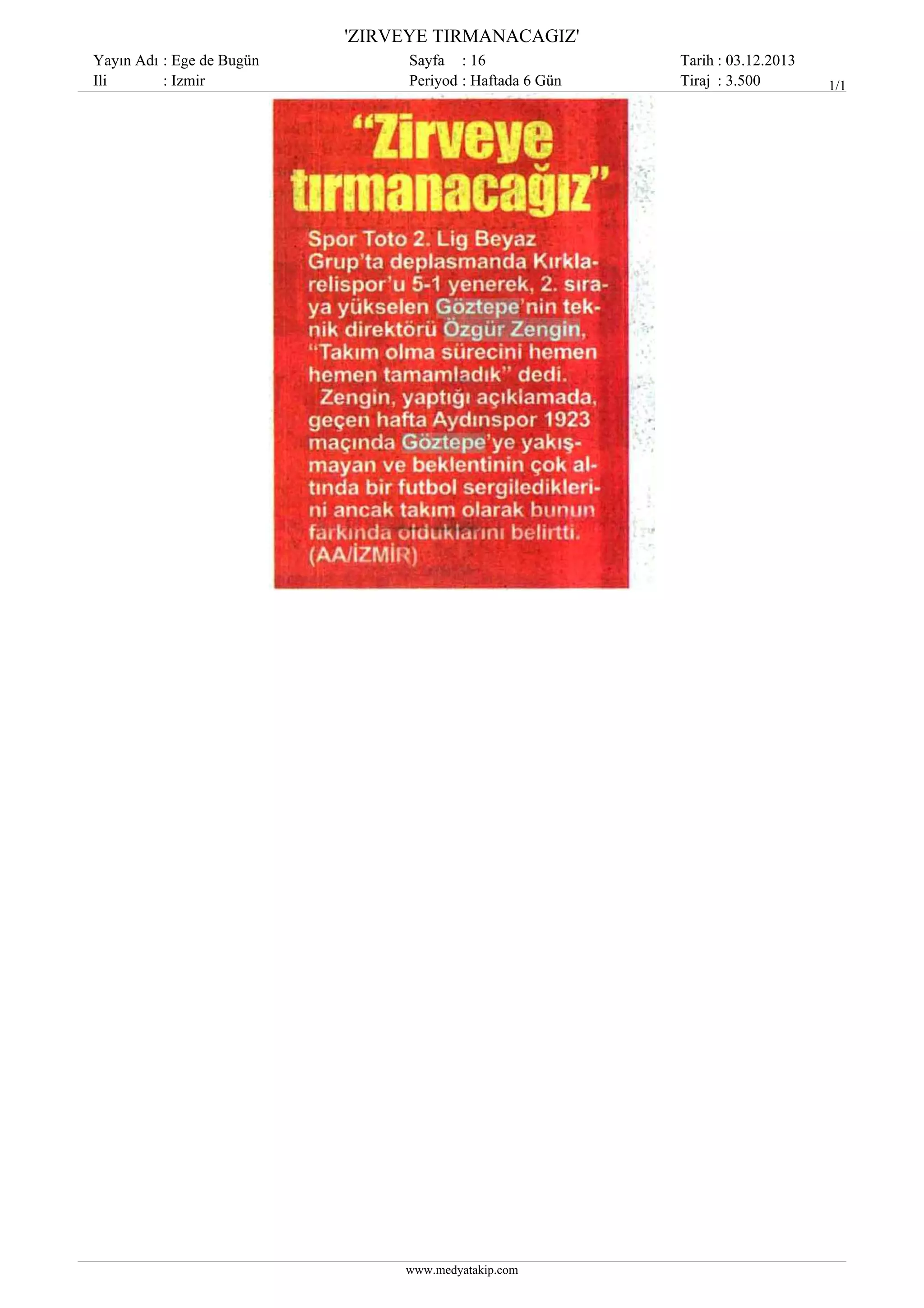 Basında Bugün Göztepe 16.11.2013